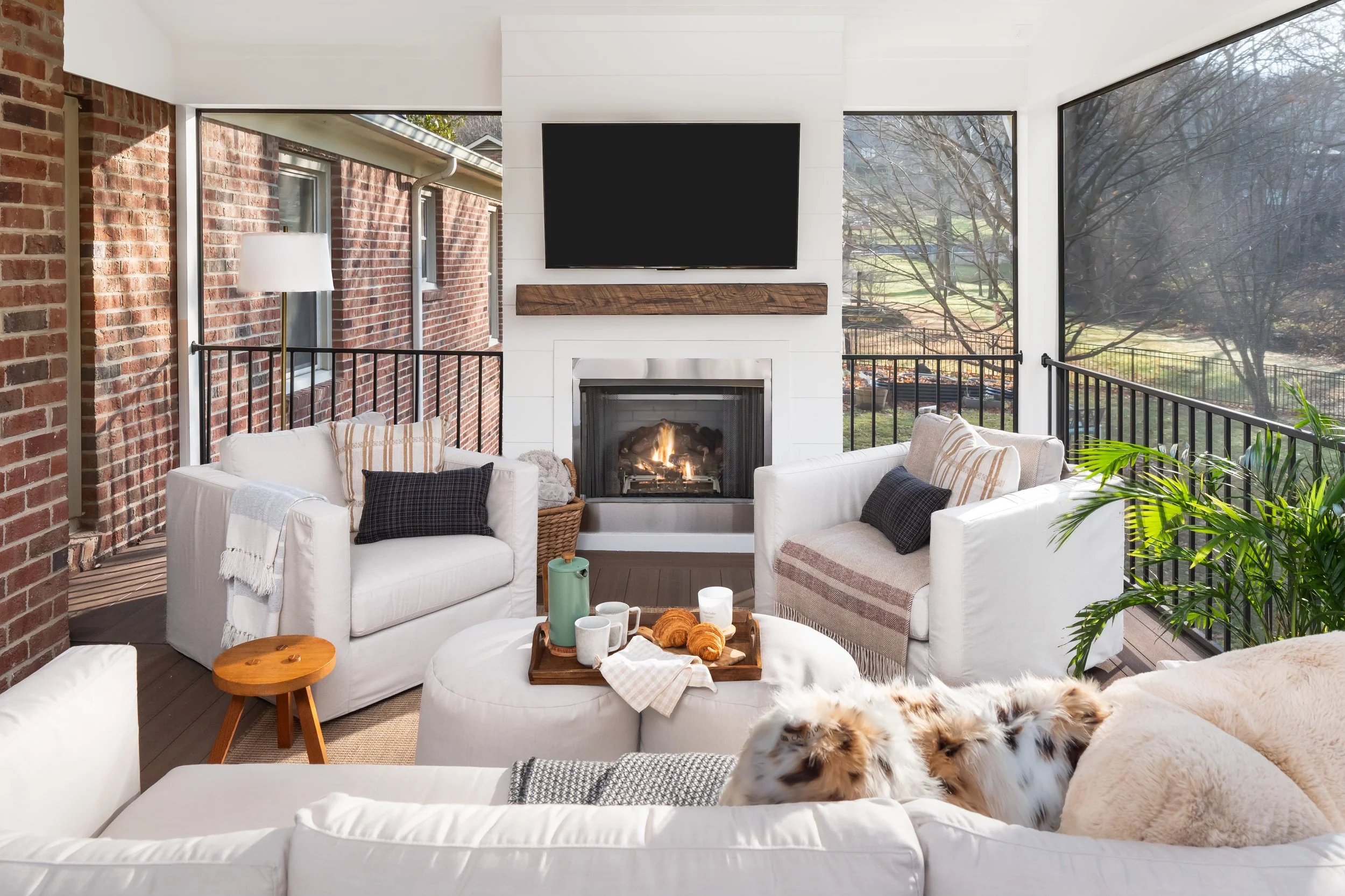 The result was a screened porch that didn’t just look beautiful—it felt beautiful. The styling pieces made it a place you’d want to linger, whether sipping coffee in the morning or enjoying an evening with friends around the fireplace.